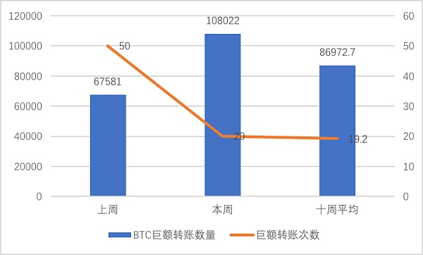 本周鏈上發生的大額轉賬(大于50BTC)的次數明顯低于近期平均水平。相比上周,大額轉賬次數下降了近20%,相比十周平均值也下降了10%。大額轉賬數量不降反升,主要是由于OKEx、Bitfinex等幾個交易所整理錢包形成了大額的鏈上轉賬。