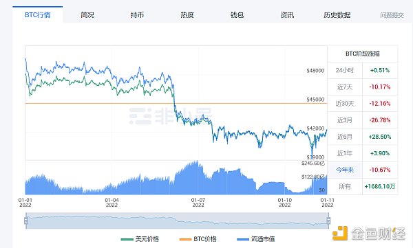 傳統市場的恐慌動蕩蔓延至加密貨幣市場。比特幣一度下破40000美元/枚關口,為去年9月22日以來首次,較去年11月高點回落29000美元,日內跌超5%。市場普遍認為,一旦美聯儲正式開啟縮表和加息動作對市場進行“降溫”,包括加密貨幣在內的風險資產或將迎來下跌預期。