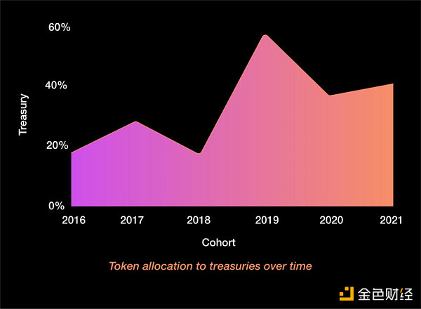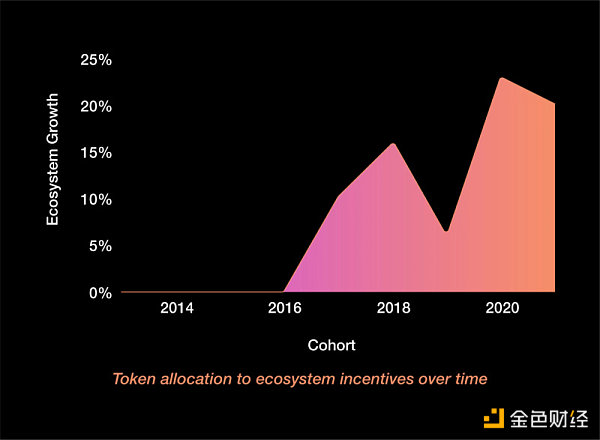 生態系統激勵的代幣比例大幅增加,從 2016 年的 0% 增長到 2021 年的 20% 以上。