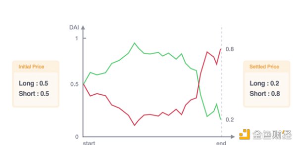 Long 的結算價會與期間累積的利率大小有關,其價格限定于$0 至$1 之間,而Short 的結算價則為1 - Long,兩者互補,因此若Long 的價格上漲,Short 則會自動下降,反之亦然。
