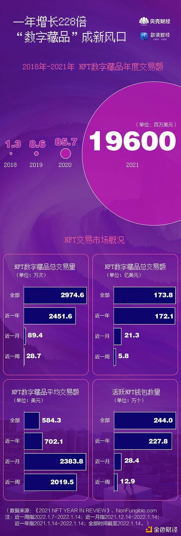 2021年被稱為“NFT”(非同質化代幣Non Fungible Token)元年。在海外,這一年圍繞NFT的交易額超過196億美元,是2020年體量的228倍。NFT數字藏品共創造超816萬總交易量和超65億美元的總交易額。