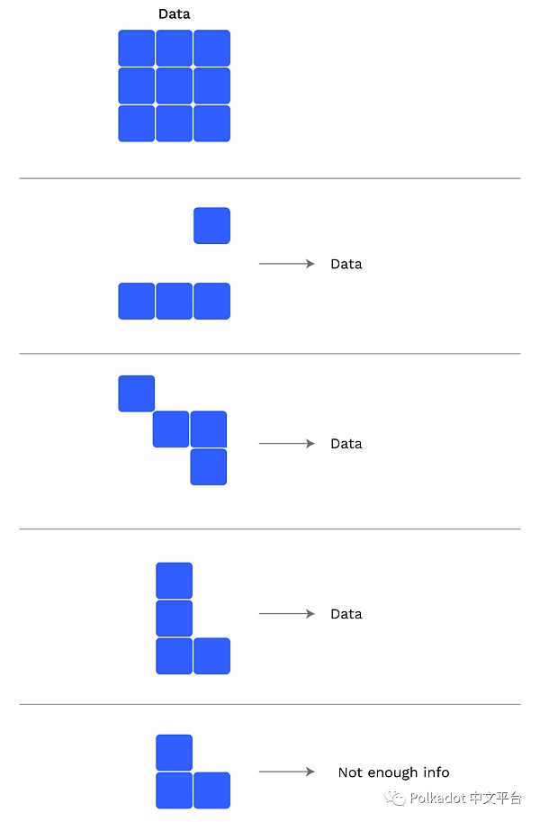 在此示例中,數據被拆分為 9 塊,任何 4 塊或更大的子集都可以恢復完整數據
