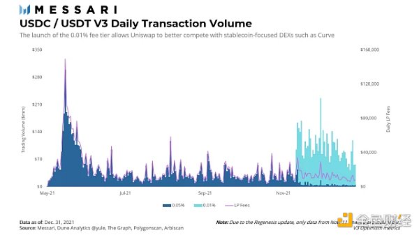 5 月,Uniswap 發布了其 DEX 的 V3,其中引入了每個市場的費用等級的概念。層級背后的想法是通過根據波動性區分不同市場來提高資本效率。波動較大的市場將收取更高的交易費用,而移動更緊密的貨幣對將收取較低的費用。V3 發布時創建了三個等級:0.05%、0.30% 和 1.00%。在第四季度,Uniswap 治理通過了第四個 0.01% 的費用等級,旨在解決穩定幣交易并與 Curve Finance 等專業 AMM 競爭。