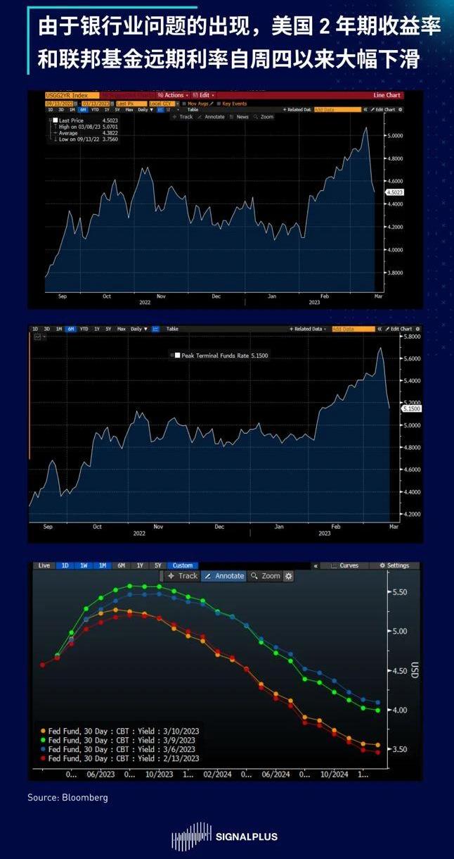 回到市場反應方面,目前為止反應最大的是固定收益市場,2年期收益率下跌約60個基點,整個聯邦基金曲線下移了55個基點,這是因為市場再次開始預期第四季度會有降息;此外,3月會議加息50個基點的機率再次降回10%以下,市場現在認為美聯儲快速加息的隱患終于開始在系統中浮現,美聯儲將被迫暫停行動。