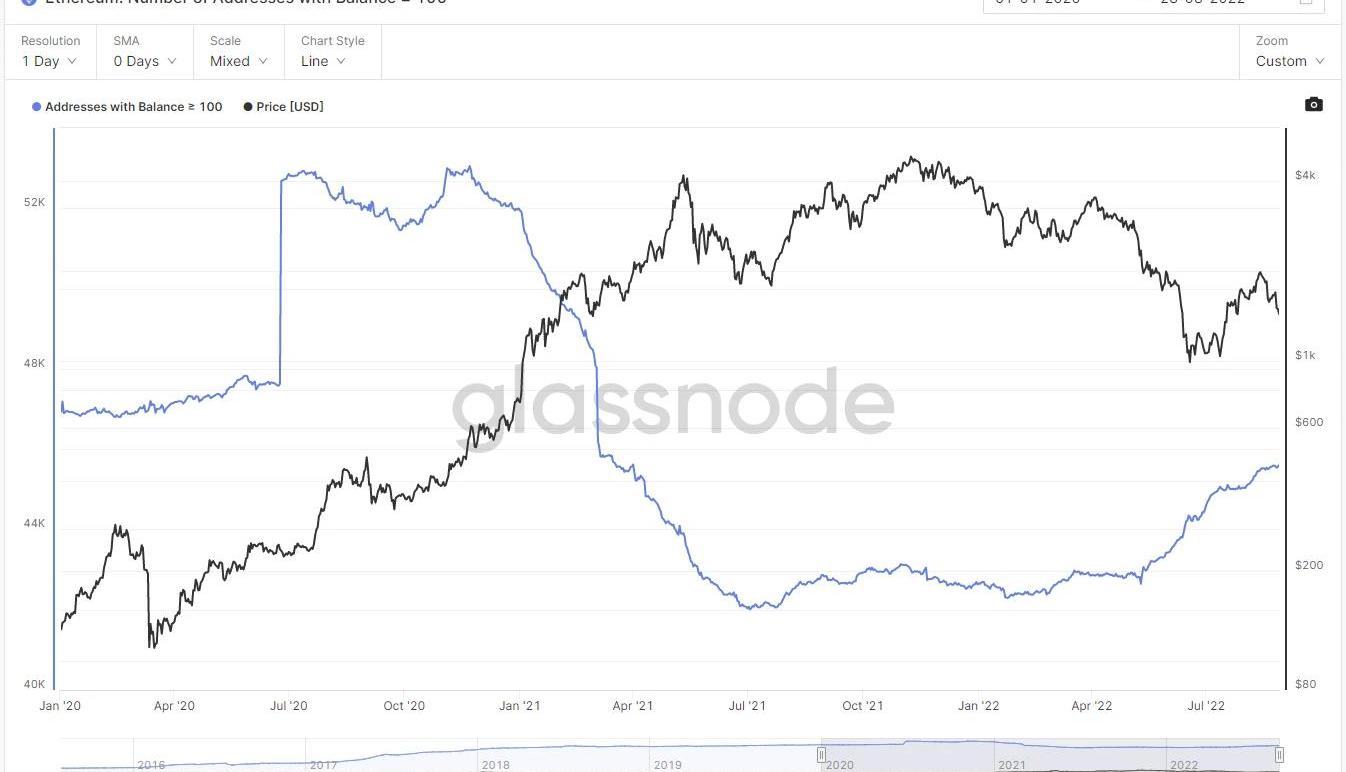 ETH持幣地址數:整體地址數均穩步上升,持幣100以下地址區域進場快速。