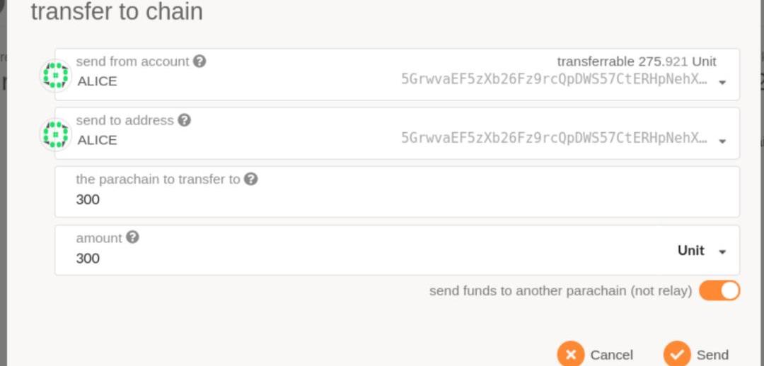 在這個例子中,Alice將從她在200號平行鏈上的賬戶發送一些資金到她在300號平行鏈上的賬戶。