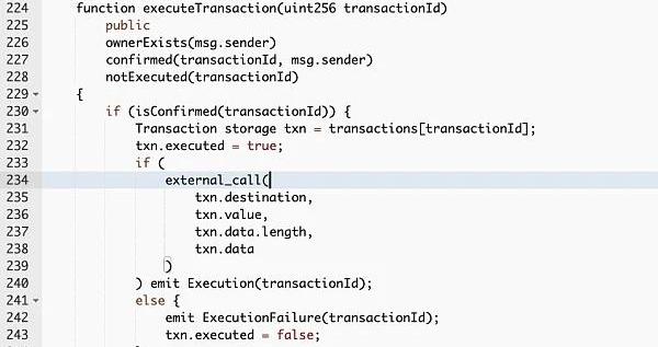 ⑤executeTransaction函數使用輸入數據調用了一個外部調用,該調用將觸發Ethmanager合約上的unlockEth函數。