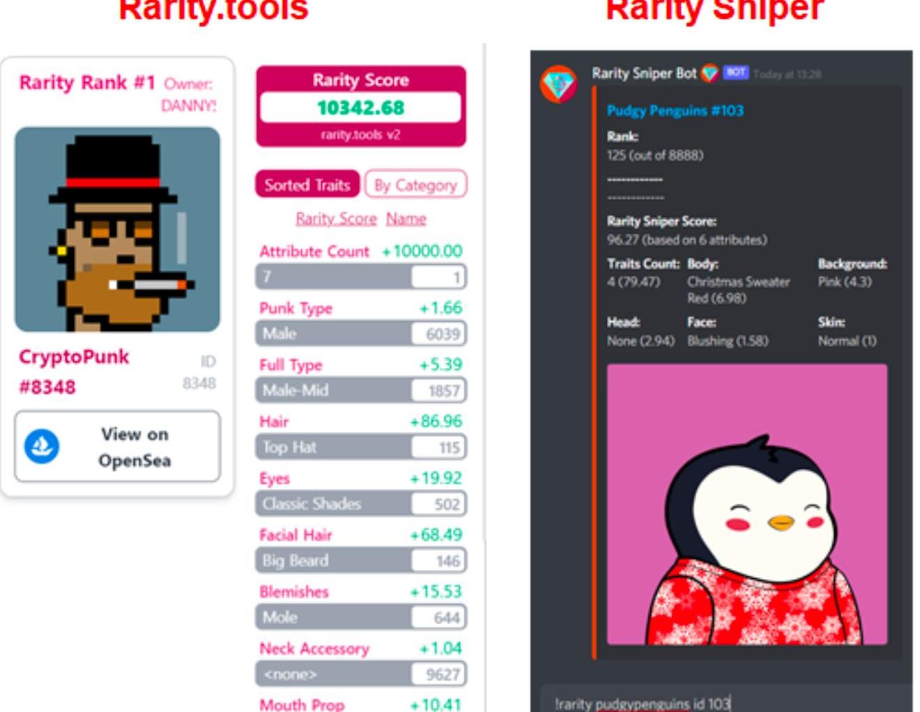 rarity.tools是一個網站,而RaritySniper作為一個discord機器人運作,用戶在其discord頻道上鍵入NFT的代幣ID。在上面的例子中,我們可以看到PudgyPenguin#103的基本得分是96.27,在整個PudgyPenguins系列中排名125。