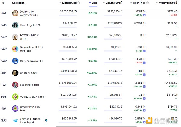 24小時內銷售漲幅前十的NFT 數據來源:NFTGO