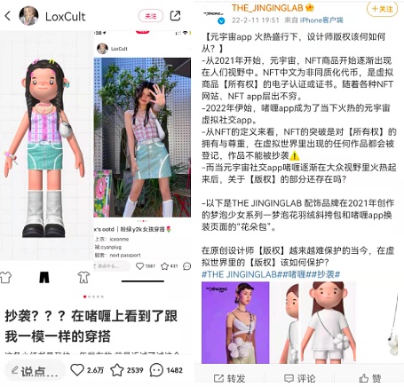 被認為可圈可點的人物形象和畫風,也被多方質疑“虛擬穿搭抄襲”。有博主表示,啫喱中出現了和自己過去筆記中一模一樣的穿搭。也有配飾品牌發文表示,在啫喱里看到了和去年自己品牌創作的一款斜挎包非常相似的花朵包。