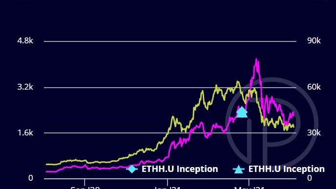 BTC和ETH走勢,黃線為BTC,紫線為ETH