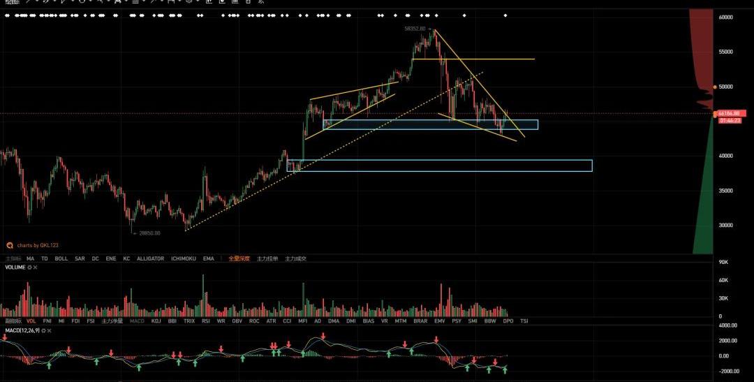 如圖所示,自上期報告后比特幣受到反壓線壓制,反彈不過并于圖中所畫第一檔支撐區下沿附近43000止跌,即下跌楔形結構下軌處,當前在結構內部出現反彈,重點關注反彈力度能否突破楔形結構上軌壓制,若突破則目標位看向48400和52000;短期支撐區43000-44000附近已被測試過三次,有效度大大降低,下方有效支撐仍然關注圖中最下方藍色矩形區間37800-39400。