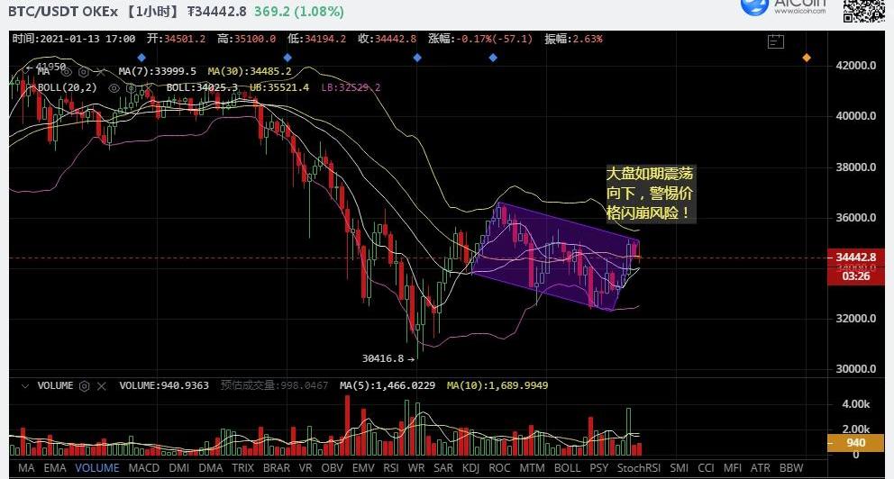 正如之前所判斷的一樣,比特幣BTC未來一段的壓力位都將在35000美元至36000美元這個區間,同時價格走勢將趨于震蕩,以此修復4HMA15線下行趨勢,可以看到,今天開盤以來,比特幣的價格在32500美元至35000美元這個區間平穩震蕩,從K先來看,今天的走勢比較無聊,對于接下來的走勢,比特幣本周仍然會選擇震蕩向下洗盤模式,值得提醒的是,合約玩家本周需要控制好倉位,震蕩模式下,反復測試高低點是比特幣常規操作。而對于現貨玩家,比特幣已經到了風險大于收益的價格,適當地出一點保留利潤也是不錯的選擇。上方壓力位:36500美元第一止損位:32000美元,第二止損位:30000美元。
