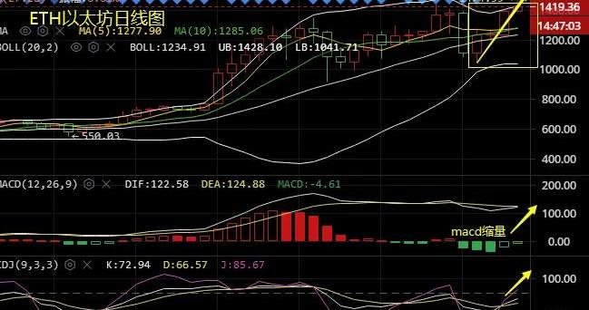 以太坊亞盤震蕩拉漲,歐盤處于橫盤維持在1420美元附近調整。小時線上看以太坊交投于兩大均線附近,BOLL呈縮口狀態,短期內重點關注BOLL上軌于1480美元一帶壓制,下方則需關注BOLL下軌于1390美元一帶支撐情況。短周期KDJ技術指標緩和向下,附圖MACD下行勢能放量,預計以太伴有回調的風險。從今日的走勢來看,以太經過亞盤的大漲之后,歐盤有回調的勢頭但并沒有下跌,相反維持橫盤,畢竟大趨勢多頭強勢支撐,短線上謹防回調,但不要期望過多的回調。下方的話則重點關注1400/1380/1360各個階段的支撐,回落的話即可分批布局多,獲利分批減倉。對于現.貨強調的太多了,估計跟上談老師操作的人都已經賺翻了吧,以太坊的勢頭良好,記住,回調就是多。