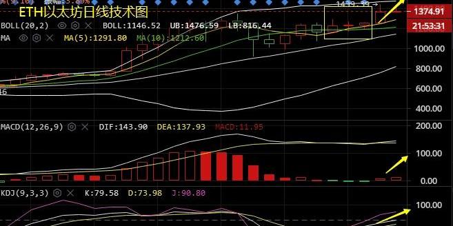 以太坊,持久性的震蕩之后,終于迎來了破位,日線一根大陽直接穩固了其多頭趨勢,BOLL呈開口狀態,經過一周的調整以太上行空間向上延伸至BOLL上軌1480美元一帶,均線MA5/MA10持續性金叉支撐其上行,短期多頭沖破各大阻力并一舉刷歷史新高,上方沒有明顯阻力,暫可參考1430美元一帶阻力,而下方則需關注1350美元一帶支撐情況。短周期KDJ技術指標緩和向上,附圖MACD上行動能放量,預計以太坊將繼續維持震蕩上行趨勢。