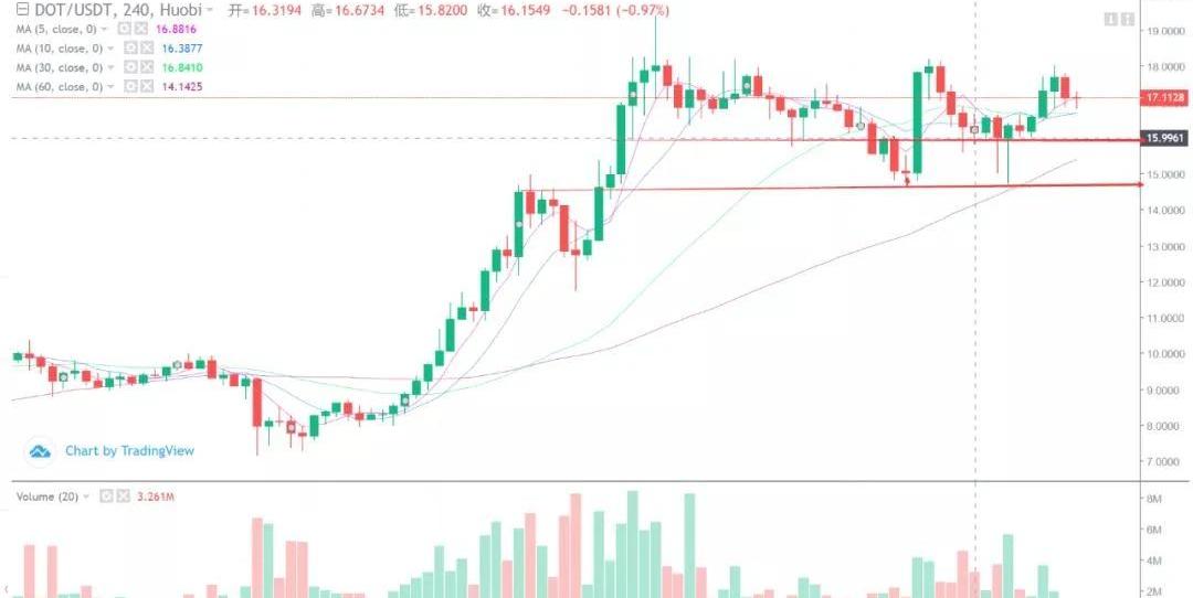 DOT強勢,15-16成為了新的4H中樞內部分界線,可以緊靠兩線繼續建倉。