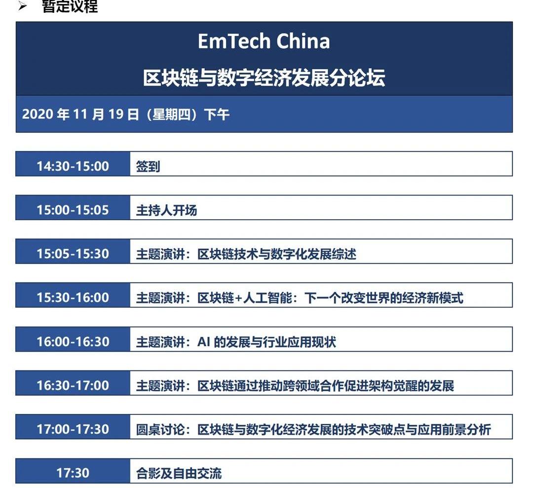正因為挑戰與機遇的并存,隨著2020即將走到尾聲,如何更好的重新回顧這些技術洞察,探索區塊鏈應用如何成為未來企業革新的顛覆性力量,同時更好的促進區塊鏈與各領域再一次的深度探討合作與發展機遇,2020年11月20日,《麻省理工科技評論》將在蘇州相城區中惠鉑爾曼酒店,舉辦EmTechChina2020區塊鏈與數字經濟發展分論壇,邀請10位專家、企業,共同探尋區塊鏈未來應用的無限可能,打開未來的大門,窺視產業的一角。