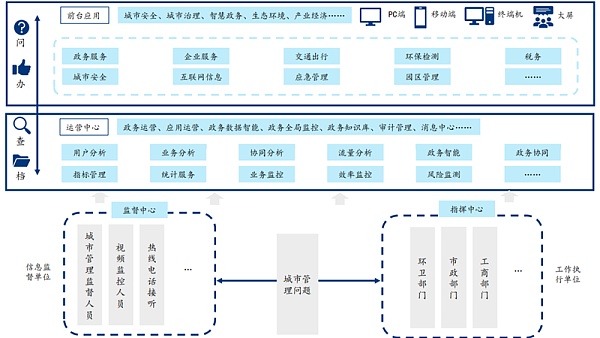 同時在組織設計上,與傳統城市管理模式相比,智能化城市更強調監管分離,將信息收集和監管評價職能剝離開來,設立了專業部門如市政管理委員會、環衛部門、民政部門等,以及行政部門如區政府、街道辦事處、社區委員會等。這種推行主體演變的趨勢更加強調了城市管理參與方的多樣性,也更關注數據在各部門和各參與方之間流動的時效性和保密性。
