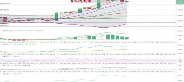 BTC行情分析:日線圖中,布林通道開口向上,比特幣行情已經站在布林帶上軌上方,今日可以上方短期壓制位在11500一線,其次11577一線。日線上多頭量能在持續釋放,短期的支撐位在11800一線,其次多空是否反轉。