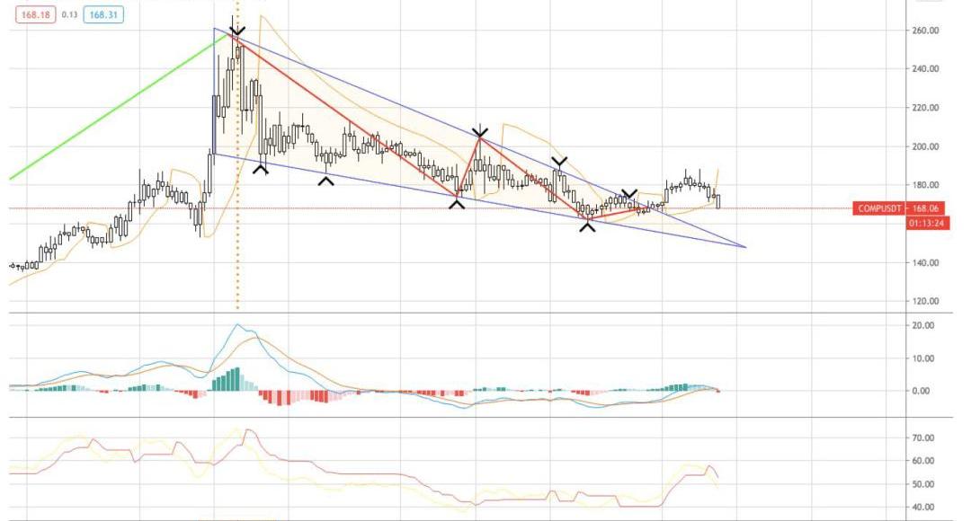 近期,COMP形成了一個下降三角形。如下圖所示,這個下降楔形在下降支撐和下降阻力上都有許多驗證點。兩者都有超過三個驗證點,增加了形成合法的可能性。COMP一直在三角形內,走勢非常典型。