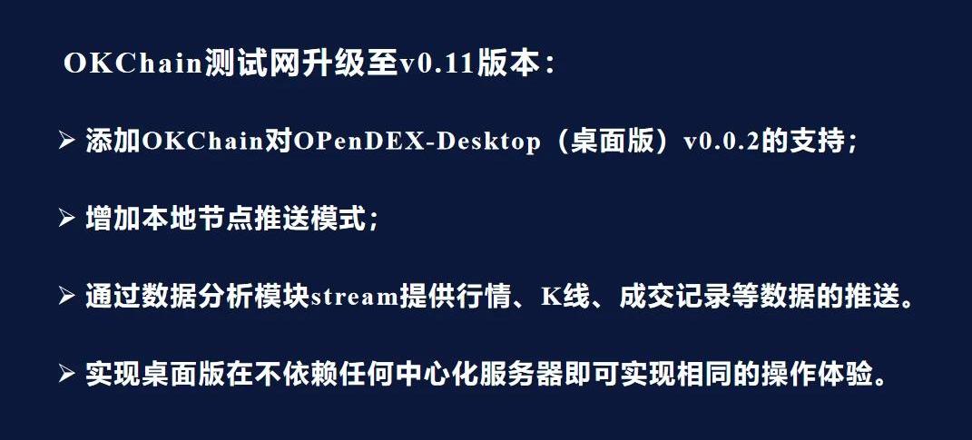 1、測試網升級完成:8月26日OKChain測試網完成至v0.11.0版本的新升級。此次升級包括: