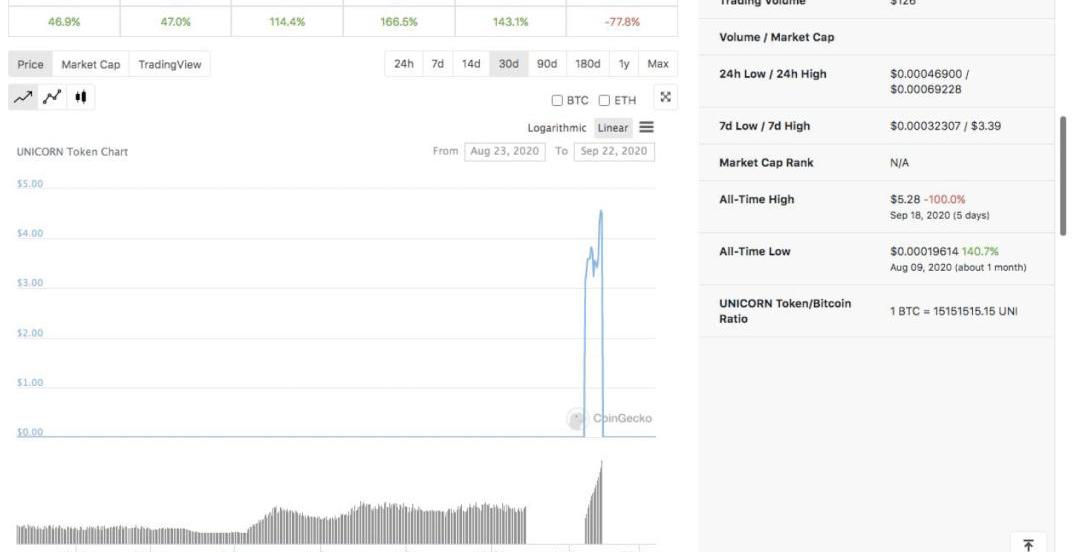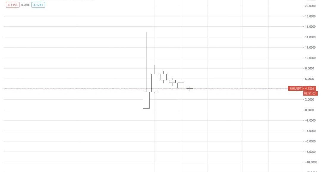 在這期間,發生了一件引人注目的事情。用戶看到UNI上市都想參與其中并買入大量的UNI,但他們購買的UNI其實是Unicorn。這讓Unicorn暴漲50萬%,然后迅速崩盤99.99%。UNI的圖表如下所示。加密貨幣世界從不讓人失望。