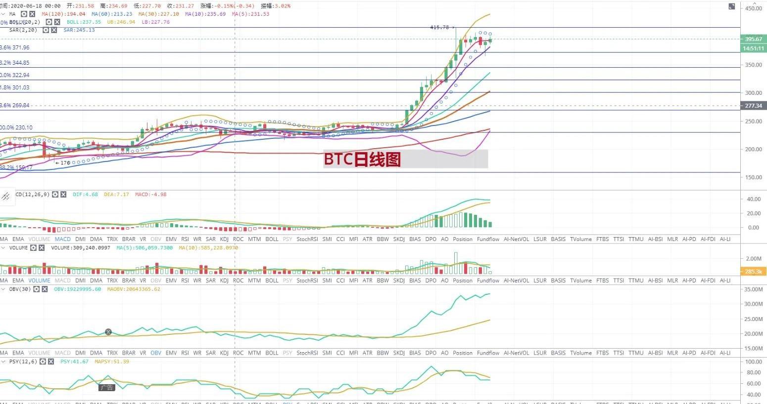 在4小時圖中,昨日晚間的下跌趨勢已經打破了幣價的窄幅震蕩區間,目前幣價有跌破下軌一線趨勢,晚間上方400的關口沖不破,幣價下行趨勢是必然的,下方的強力支撐位置斐波那契回調線371.96一線,目前行情處于持幣者圖中箱體底部階段,如果箱體打破,下行趨勢是必然的。