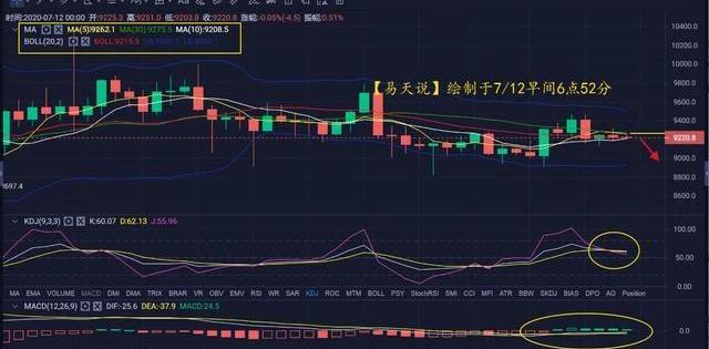 我們再從4小時圖來看一下,BOLL通道已經開始走平且有收口繼續,目前比特幣行情運行在BOLL通道中下軌區域,上方承壓在BOLL中軌處,昨日一直都沒有有效突破,黃色MA5和白色MA10均線粘合一處形成目前行情的上方壓力線;下方KDJ指標雖然死叉向下運行,但是三線已經走平,有形成金叉跡象;能量指標MACD快慢線粘合于零軸附近,空頭能量逐漸縮量中;綜合來看,易天老師(aphz8705)認為比特幣日間行情將會繼續反彈,試探上方BOLL中軌和MA30均線的粘合壓力線(9260)處,然后開始承壓回落,繼續總空頭!