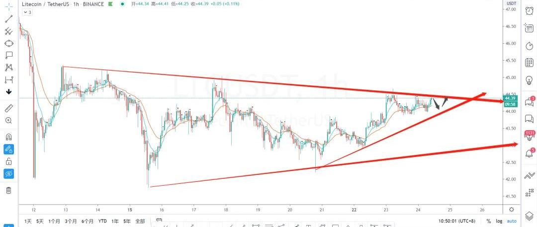 OK回到盤面上來說,BTC在1萬點關口附近已經持續震蕩了50天左右,一直在測試前高同的同時底部有抬升跡象,但高點也在下降,所以目前仍然是一個高位震蕩收斂的形態,并不能預判未來行情何時一定能突破萬刀關口