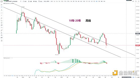 周線上,可以發現經過前期不斷下殺,價格目前已接近長期上升通道下沿支撐線附近,此處存在一定的多頭支撐,技術上只要不跌破,都不能判定長期上升趨勢的逆轉。