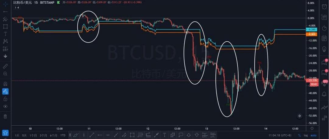 最以15分鐘為例,標記出幾個明顯波動的點,由下圖可以很明顯的發現,波幅越大的位置,是數字貨幣市場先跌,美股不動,或者美股跟跌,反彈也是數字貨幣先行,小級別來說,看美股做數字貨幣,或許并不是一個好方法,可以參考日線級別的美股走勢做一個當日的BTC價格趨勢參考,但更多的交易依據建議回到盤面