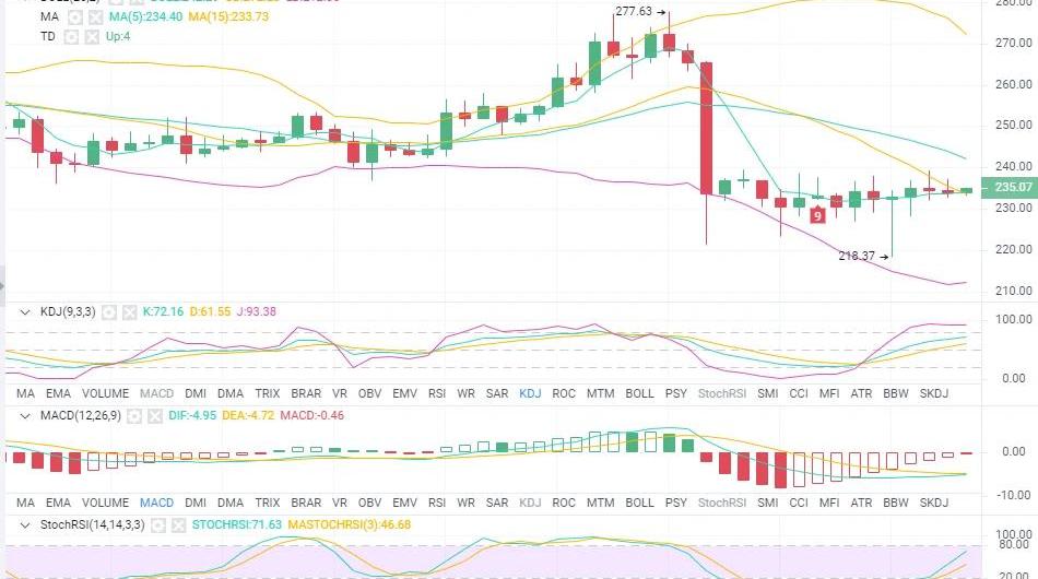 BCH:今日BCH保持區間震蕩為主,凌晨跟隨大盤回撤后,現價234附近。從小時級別看,布林帶開口向下運行,目前在布林帶中下軌區間震蕩,MACD形成底背離心態,從4小時級別看,MACD可能會形成金叉。操作上建議逢高做空為主,現貨繼續持有。壓力位250,支撐位225。