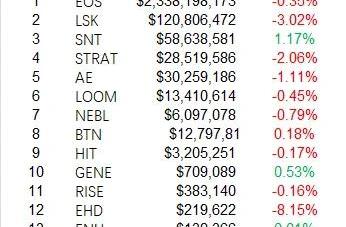 今日去中心化的Dapp平均漲幅為-0.96%,總體有下滑趨勢。上漲的有5個,下跌的有8個。其中,SNT漲幅最高為1.17%;EHD下跌達到8.15%。