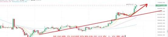 BTC合約交易;晚間行情先抑后揚走勢是大概率,目前指數有技術回落需求,60分鐘線趨勢線支撐6400附近,上方7000點整數關口壓力位