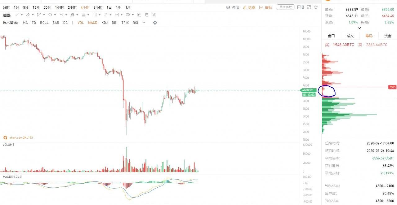 昨日至今,BTC橫盤調整,多空繼續膠著,量能持續萎縮,四小時MACD粘合,市場開始醞釀變盤。目前的位置比較關鍵,若能向上突破,則6900美元以上的空間將會打開。但近期屢攻不下的走法,說明上方壓力較大,風險大于收益,觀望為主。