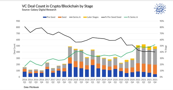 2021年Q4,加密賽道的創業公司獲得A輪融資的量最大,也有大量投資取到了A輪以后。