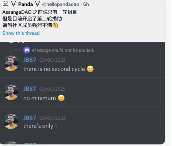 根據社區成員的說法,AssangeDAO發起方在第一輪募資時曾在社群中表明只會有一輪捐助,但在2月7日首輪募資結束后,發起方緊接著開啟了第二輪捐助。而在第二輪捐助開始后,首輪捐助者仍無法申領對應的JUSTICE通證,遭到社區成員強烈不滿。
