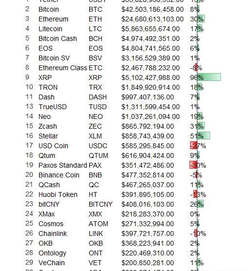 今天交易量沒有太明顯的變化,但占據總市值較多的主流幣中也都有不小的增幅。增幅最明顯的是XRP,與其大幅拉盤有關。平臺幣雖然價格繼續上漲,但交易量增速放緩,是觸頂的信號。