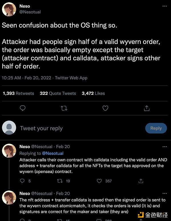 Neso發推解釋了技術方面的可能性,Neso表示,丟失資產的人可能簽署了一半有效的wyvern訂單(這是一個可以執行資產轉移的去中心化交易協議),攻擊者簽署了另一半訂單。wyvern合約非常靈活,OpenSea會在其前端/api上驗證訂單,以確保用戶簽署的內容將按預期運行,但同樣的合約仍然可以被其他人使用,如果人們簽署這樣更復雜的訂單,攻擊者就可以拿走得到正式認可的所有東西。
