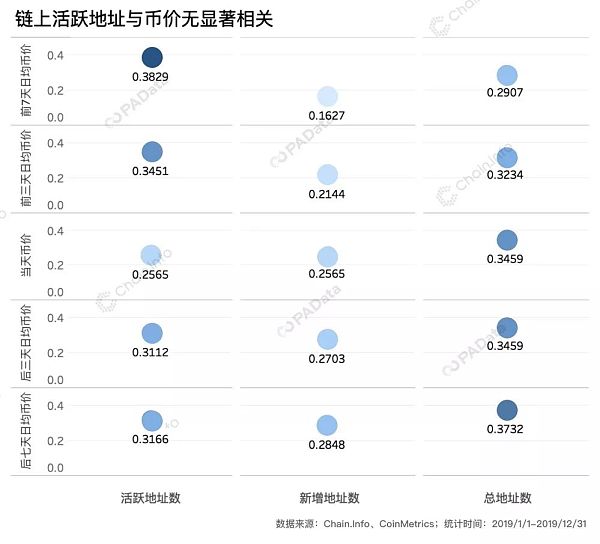 PAData分別計算了全年活躍地址數、新增地址數、總地址數和前7天日均幣價(不含當日)、前3天日均幣價(不含當日)、當天幣價、后3天日均幣價(不含當日)、后7天日均幣價(不含當日)之間的皮爾森相關系數,數值的絕對值越高,則意味著兩者之間的相關性可能越高。