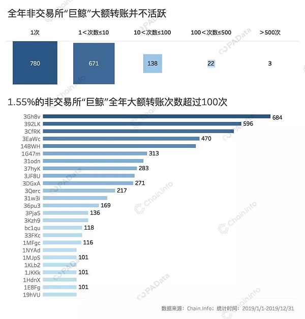 2019年非交易所“巨鯨”中大額轉賬最活躍的是“3Gh8v”,全年大額轉賬次數高達682次,相當于每周(7天)大額轉賬13次,非常活躍。另外,“392LK”、“3CfRK”、“3EaWc”、“14BWH”全年大額轉賬次數都超過450次,相當于每周(7天)發生8次大額轉賬。