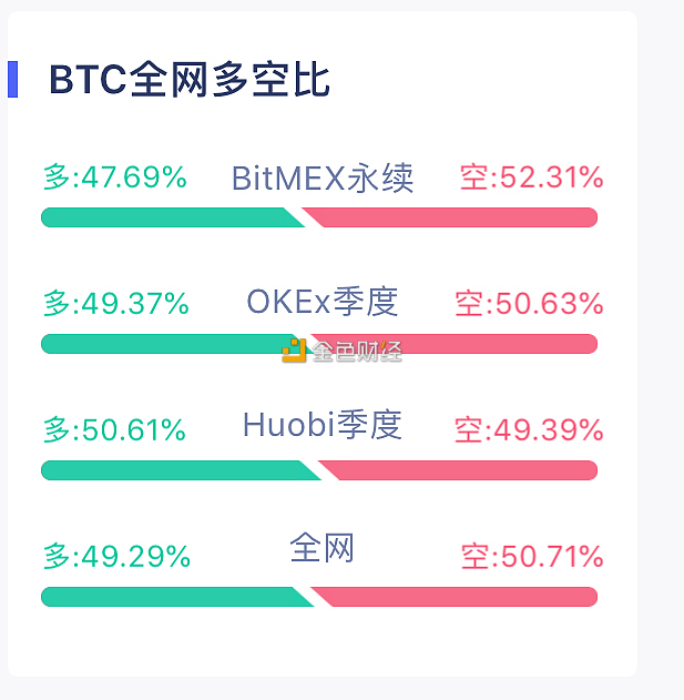 據合約帝數據顯示,最近24小時BTC全網合約成交量中開多比例為49.29%,開空比例為50.71%。主流合約交易所中,Huobi季度開多比例為50.61%,開空比例為49.39%;OKEx季度開多比例為49.37%,開空比例為50.63%;BitMEX合約開多比例為47.69%,開空比例為52.31%。
