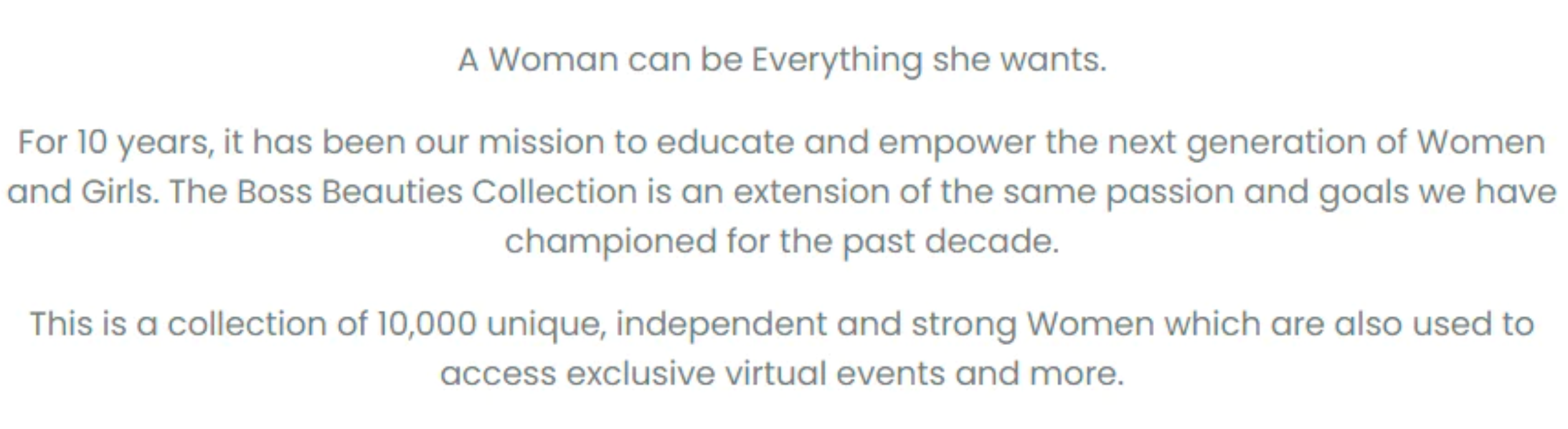 不同于電影機器逐步建立的次要認同過程,女性主義 NFT PFP 由于其跨媒介呈現具備了同時建立首要認同和次要認同的可能性,這大大加快了對女性消費者認同感進行收編的速度。諷刺的是,Boss Beauties 最醒目的宣傳語是:「A Woman can be Everything she wants」(女性可以她自己想要成為的樣子)。