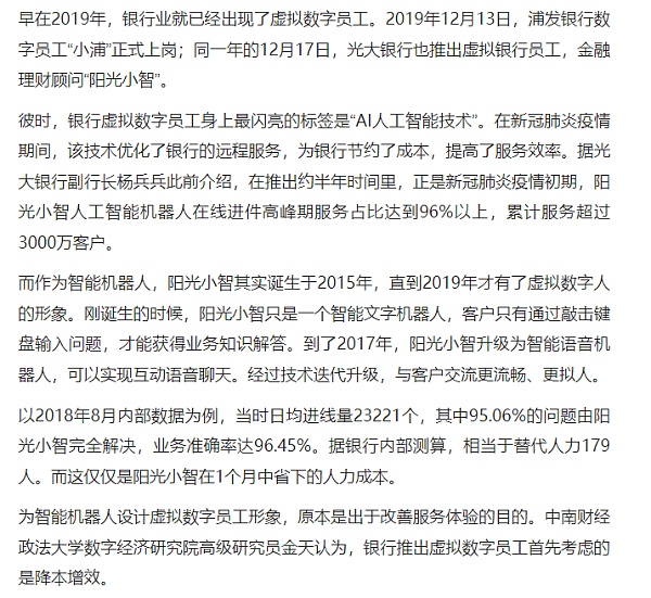 金天分析認為,在過去,銀行具有明顯的重渠道特性,一線員工數量龐大,這也是與客戶面對面營銷的必要配置。但近年來伴隨客戶行為習慣發生變化,部分人工崗位出現了被數字化服務替代的趨勢。數字員工除了可以滿足標準化業務的處理需求,由于大數據和人工智能技術的支撐,數字員工還可以更好地“理解”客戶,發掘潛在業務,能夠進一步加速相應業務場景的輕型化變革。