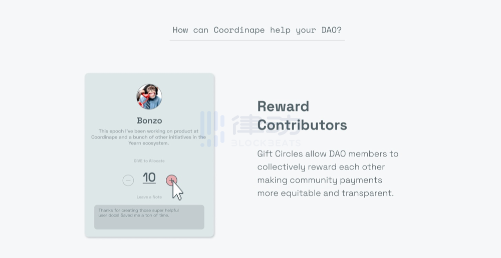 Coordinape 是 Yearn 為 DAO 推出的去中心化薪資管理系統,允許去中心化團隊和 DAO 自動為貢獻者發放獎勵或贈款,而無需自上而下的管理或雇用 HR。