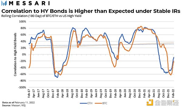極端負相關時期(2017年底到2018年和2021年底)發生在收益上升的環境中,這可以解釋與其他情況下的正相關關系的偏離。比特幣的走勢似乎更符合高收益債券的走勢。在2019年初的一段時間里,比特幣的相關性在60%以上。從直觀上看,這是有道理的,該資產正沿著風險范圍向更穩定的資產形態移動,同時仍保持風險傾向。對于這種較低的風險狀況,投資者預期的回報將低于股票類資產,ETH似乎正在成為變成那樣。