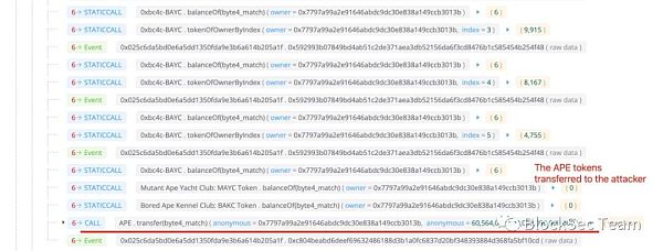 在這個過程中,攻擊者使用了6個NFT來領取空投。1060是其購買,其余5個是在上一步獲得。通過空投,攻擊者共計獲得60,564 APE tokens獎勵。