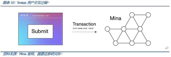 具體運行上,證明功能在用戶的web瀏覽器上完成,其生成的零知識證明(驗證密鑰)則會被存儲在給定Snapp賬戶的鏈上,之后發送至Mina網絡進行驗證。因此,交易的生成和數據計算在鏈下完成,同時該過程會生成可用于驗證交易的零知識證明,而用戶原始私有數據隱私是得到充分保護的。鏈上只負責對該證明進行驗證,通過驗證后將其上鏈保存,并對Snapp的狀態進行更新。