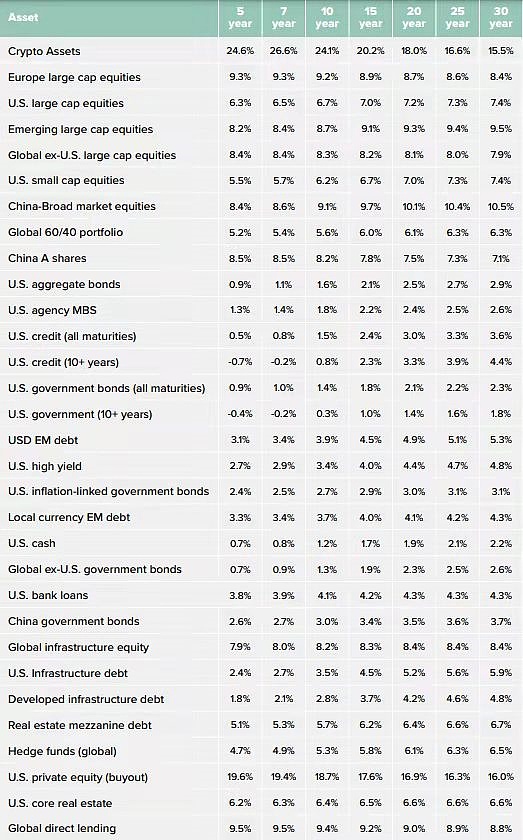 我們的加密資產不僅能為投資者提供過去的利益,而且能為投資者提供未來的利益。基于Grayscale當前的長期加密市場假設,我們認為,在與其他替代方案一致之前,該資產類別在未來幾十年內可以提供比幾乎所有其他資產類別更高的預期回報。
