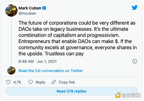 對于企業來說,新的基礎設施和去中心化自治組織(DAO)發揮的作用,在智能合約和治理協議的幫助下,可能會取代區塊鏈財團成為行業焦點。DAO甚至獲得了更多傳統投資者的關注,包括億萬富翁馬克-庫班,他稱DAO是 "資本主義和進步主義的最終結合"。"隨著DAO對傳統企業的沖擊,企業的未來可能會非常不同,他在5月的推特上稱,如果社區在治理方面表現出色,每個人都會分享到上升的機會。